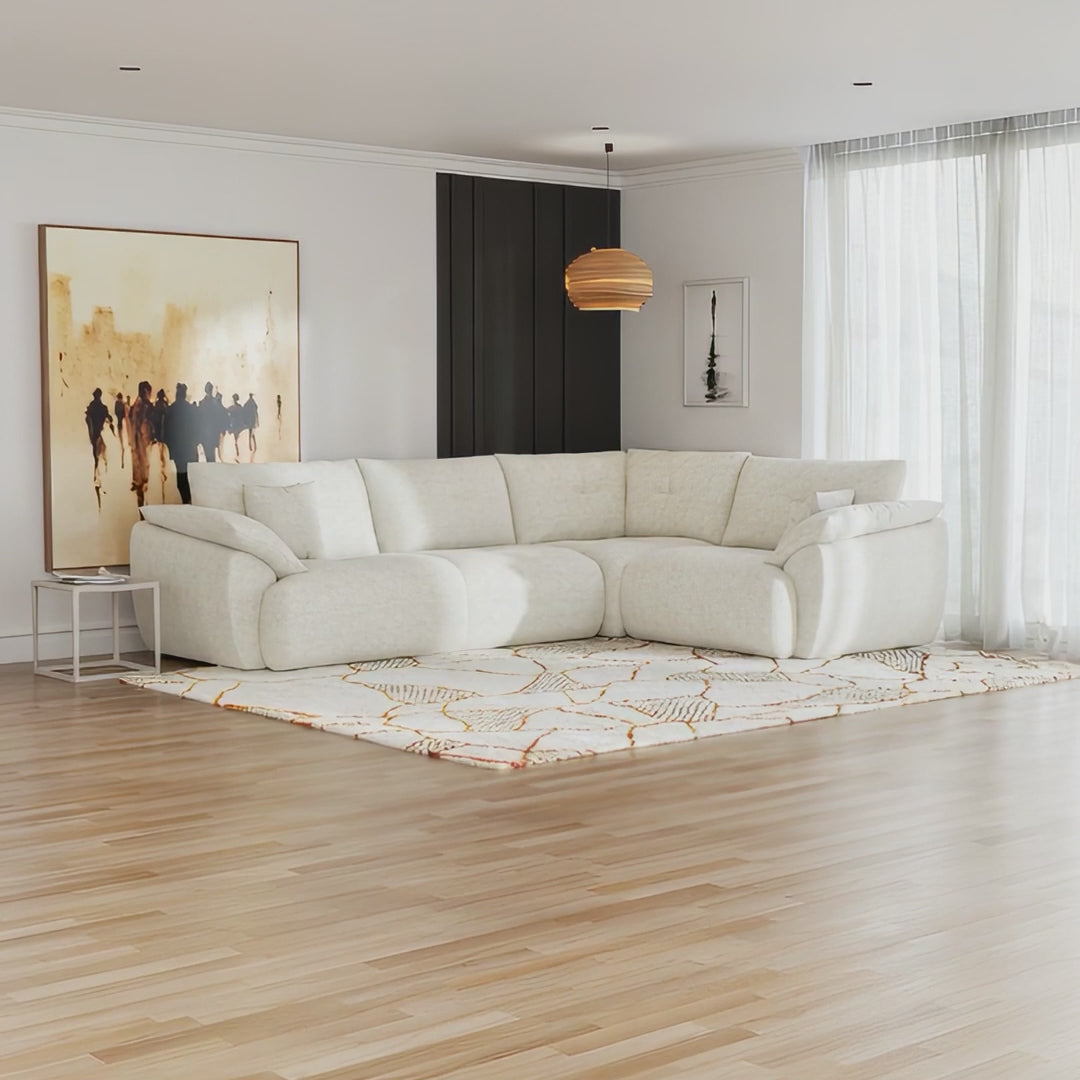 Le sofa sectionnel BULLE blanc cassé est conçu avec un revêtement en tissu chenille, une structure robuste en bois, ainsi qu'un rembourrage de coussins composé d'un mélange de coton et de mousse de haute qualité.