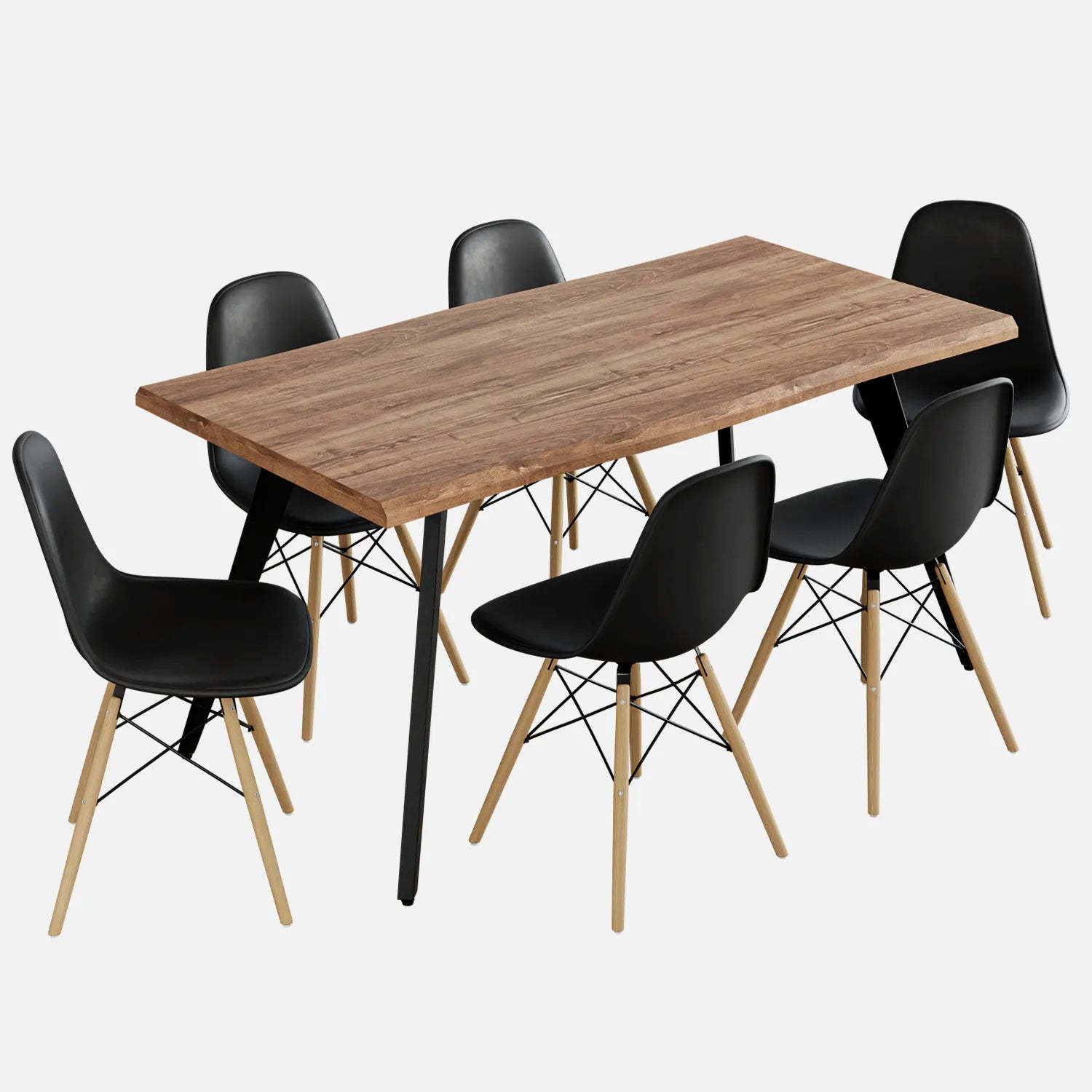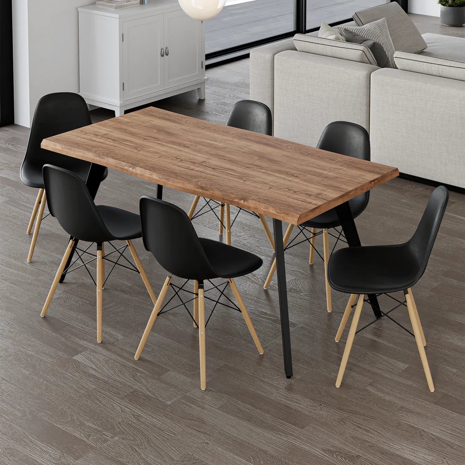 Transformez vos repas en moments mémorables avec l'ensemble de salle à manger CHĒNE. Son plateau au fini chêne foncé offre une allure chaleureuse et sophistiquée, tandis que ses chaises au design scandinave ajoutent une touche contemporaine. Parfait pour un espace convivial et élégant.