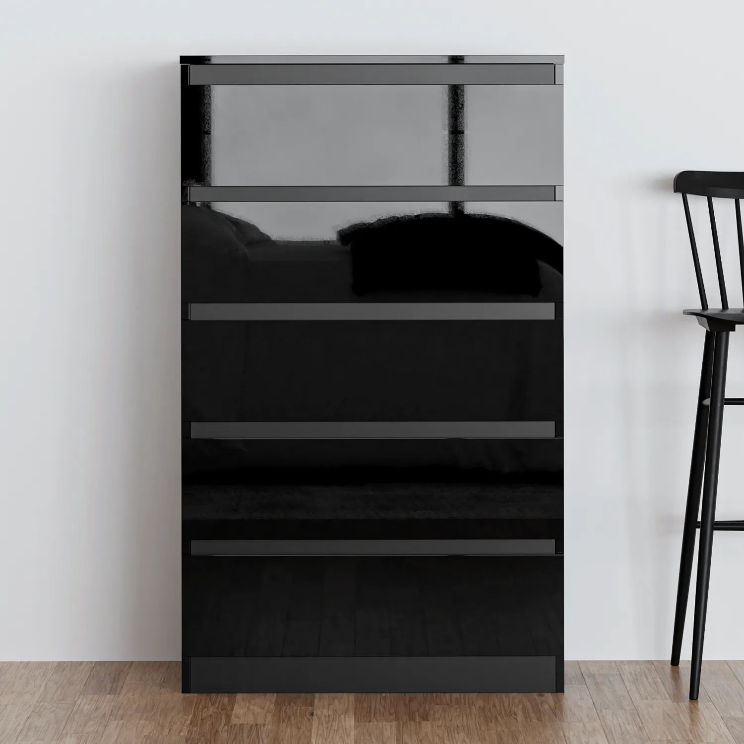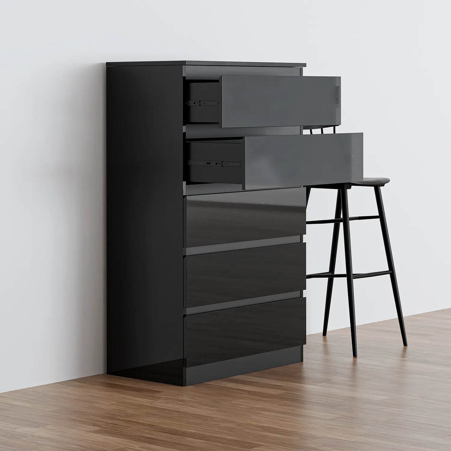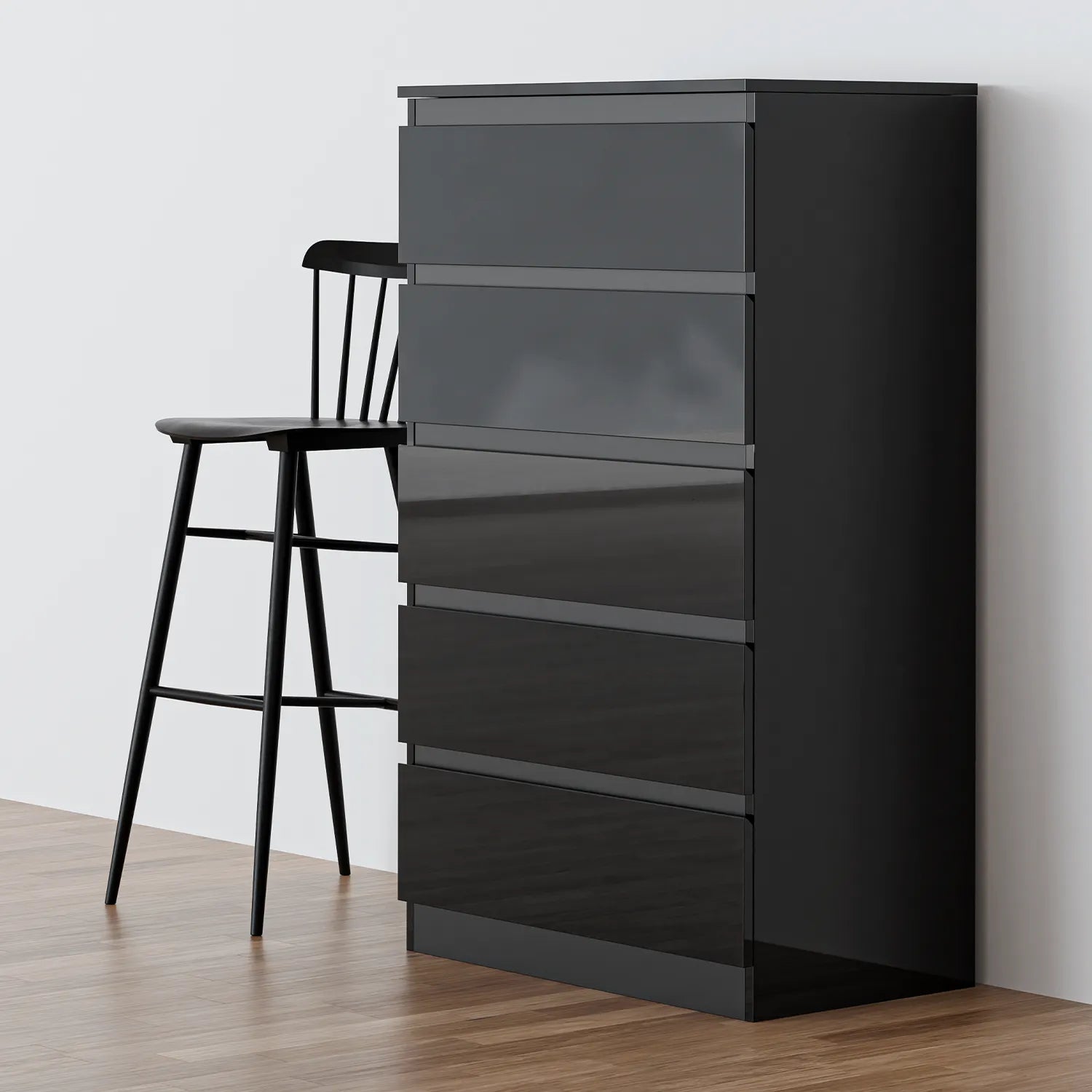 Ajoutez une touche moderne et fonctionnelle à votre chambre avec la commode à 5 tiroirs COMOD. Ses 5 tiroirs spacieux et son fini noir lustré offrent une organisation élégante et un design épuré qui s'intègre parfaitement à tout décor contemporain. Style et praticité en harmonie.