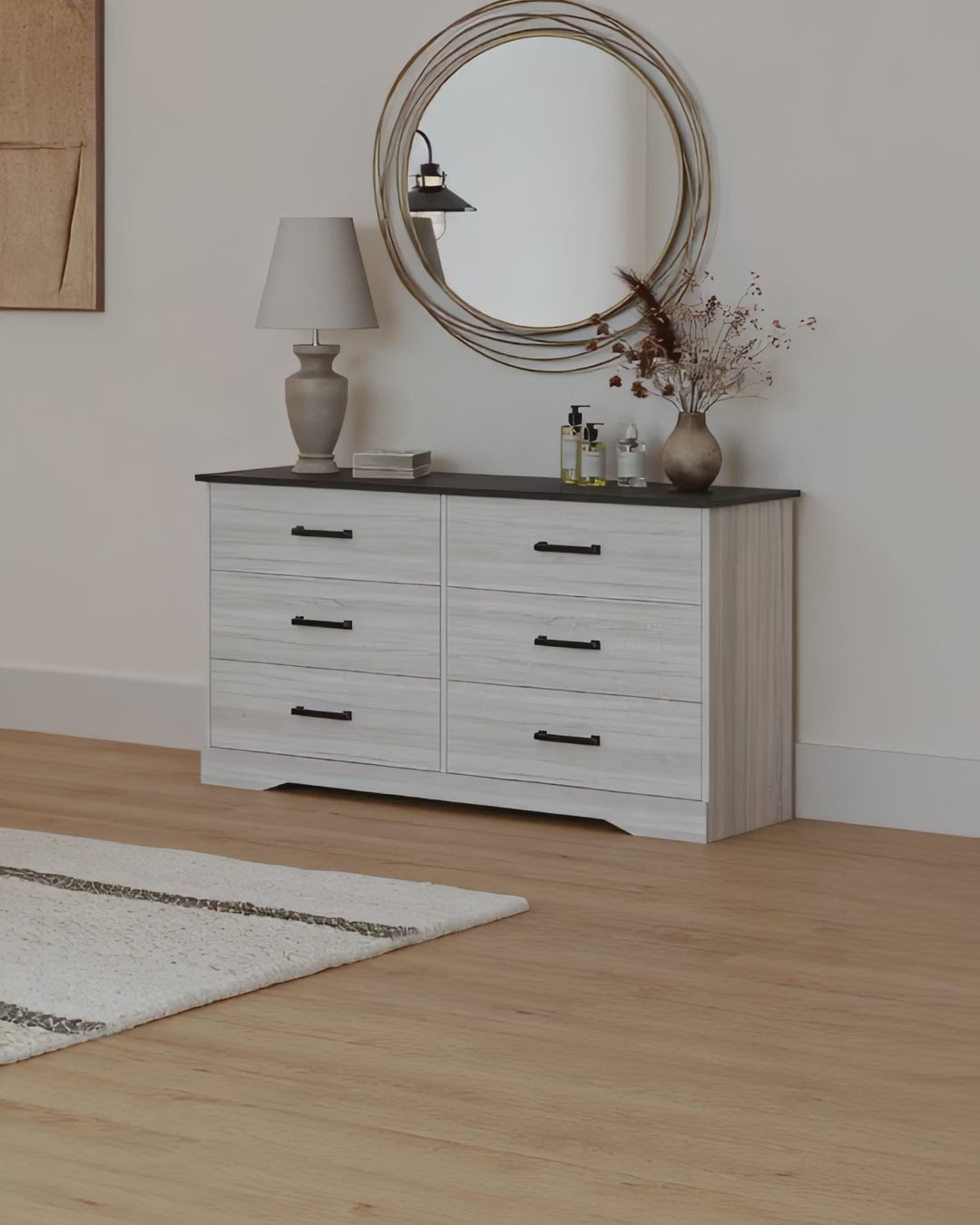 Apportez une touche d'élégance rustique à votre espace avec la commode FĀRM à 6 tiroirs. Ses lignes épurées, ses poignées modernes et son mélange de plaqué gris chêne et de gris apportent un charme intemporel. Une solution parfaite pour organiser votre quotidien avec style.