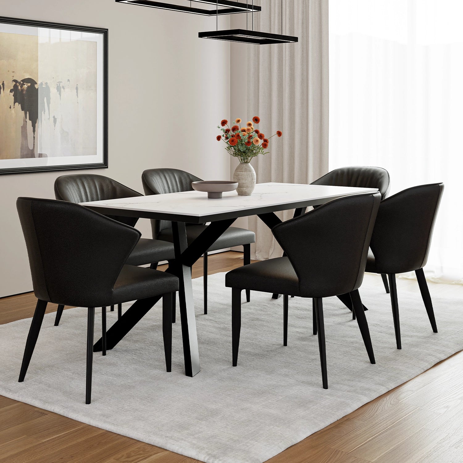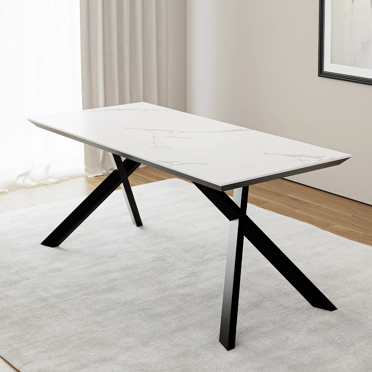 Ajoutez une touche d'élégance intemporelle à votre salle à manger avec la table de cuisine LŪTRA. Son plateau en immitation de marbre blanc repose sur une base d'acier noire moderne et robuste, créant un contraste saisissant. Idéale pour les repas en famille ou les dîners sophistiqués. Un véritable bijou pour votre intérieur.