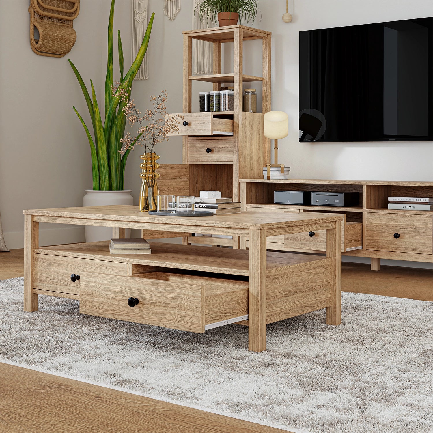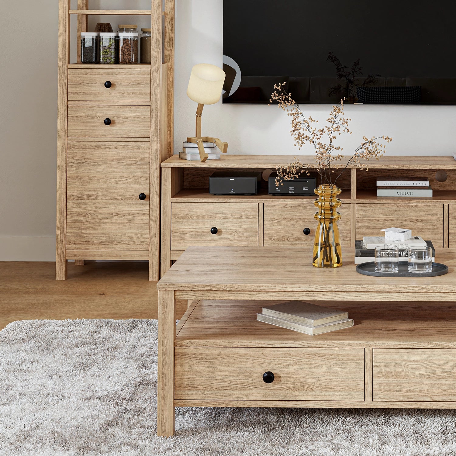 Collection MĀRLO : meuble TV, table basse et bibliothèque style scandinave en chêne clair. Design minimaliste, lignes épurées et finitions soignées. Nombreux rangements : tiroirs, niches et passe-câbles. Idéale pour un salon chaleureux et moderne, robuste et pratique, pensée pour optimiser l’espace. Pour TV 75", plateau spacieux.