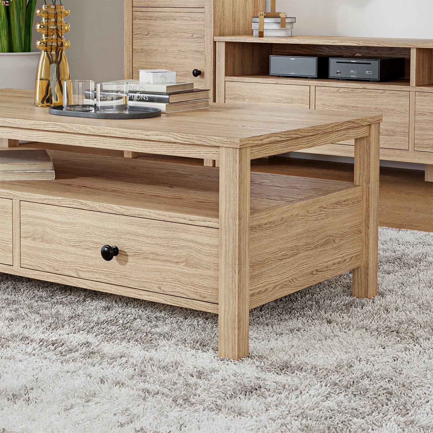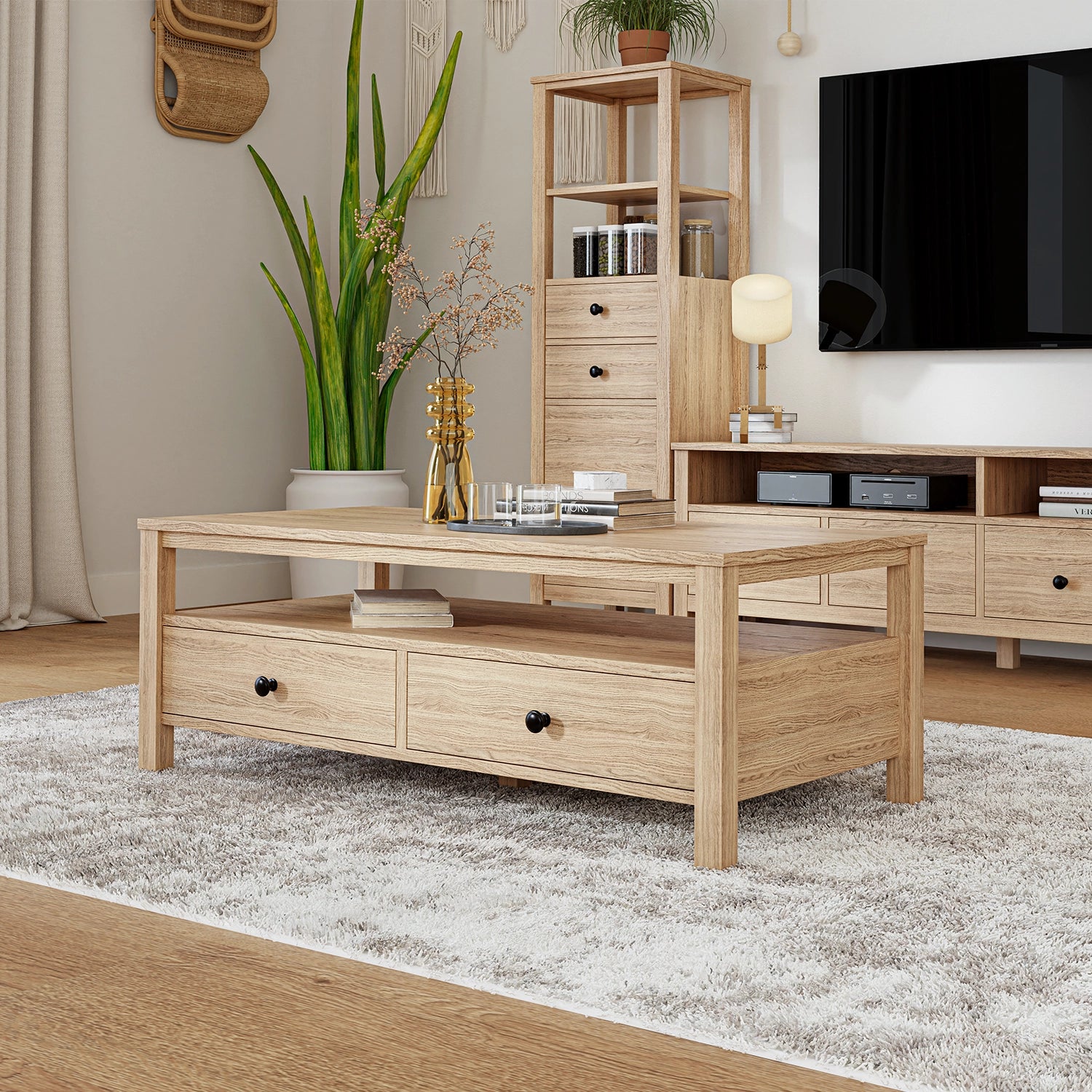 Avec son design chaleureux en laminé de bois fruitier, la table basse MĀRLO allie élégance et fonctionnalité. Elle offre deux tiroirs pratiques et une tablette ouverte pour vos essentiels du salon. Parfaite pour compléter un décor moderne et harmoniser avec le meuble télé MĀRLO.