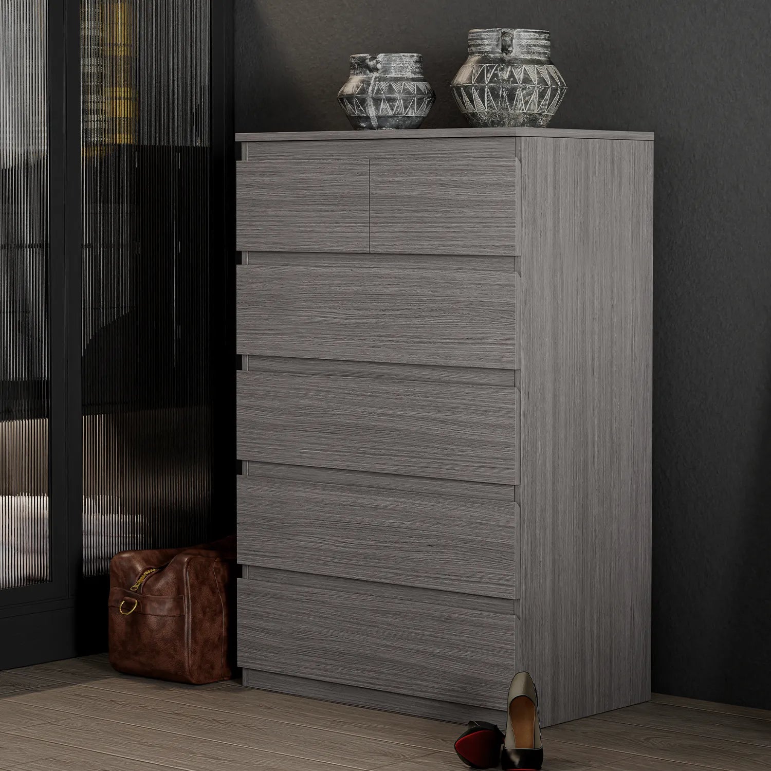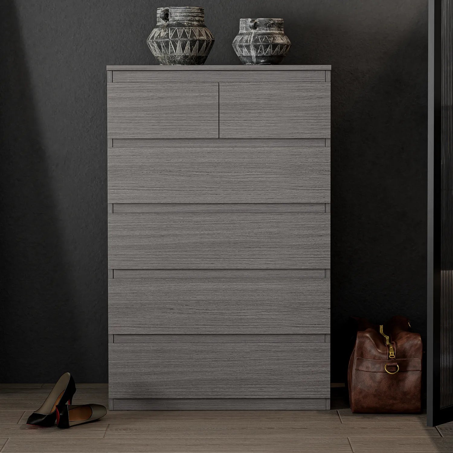 Optimisez votre rangement avec la commode haute OLIT. Son design élégant en gris chêne et ses lignes épurées s’intègrent parfaitement dans un intérieur moderne. Avec ses 6 tiroirs spacieux, elle combine esthétique et fonctionnalité pour garder vos espaces bien organisés.