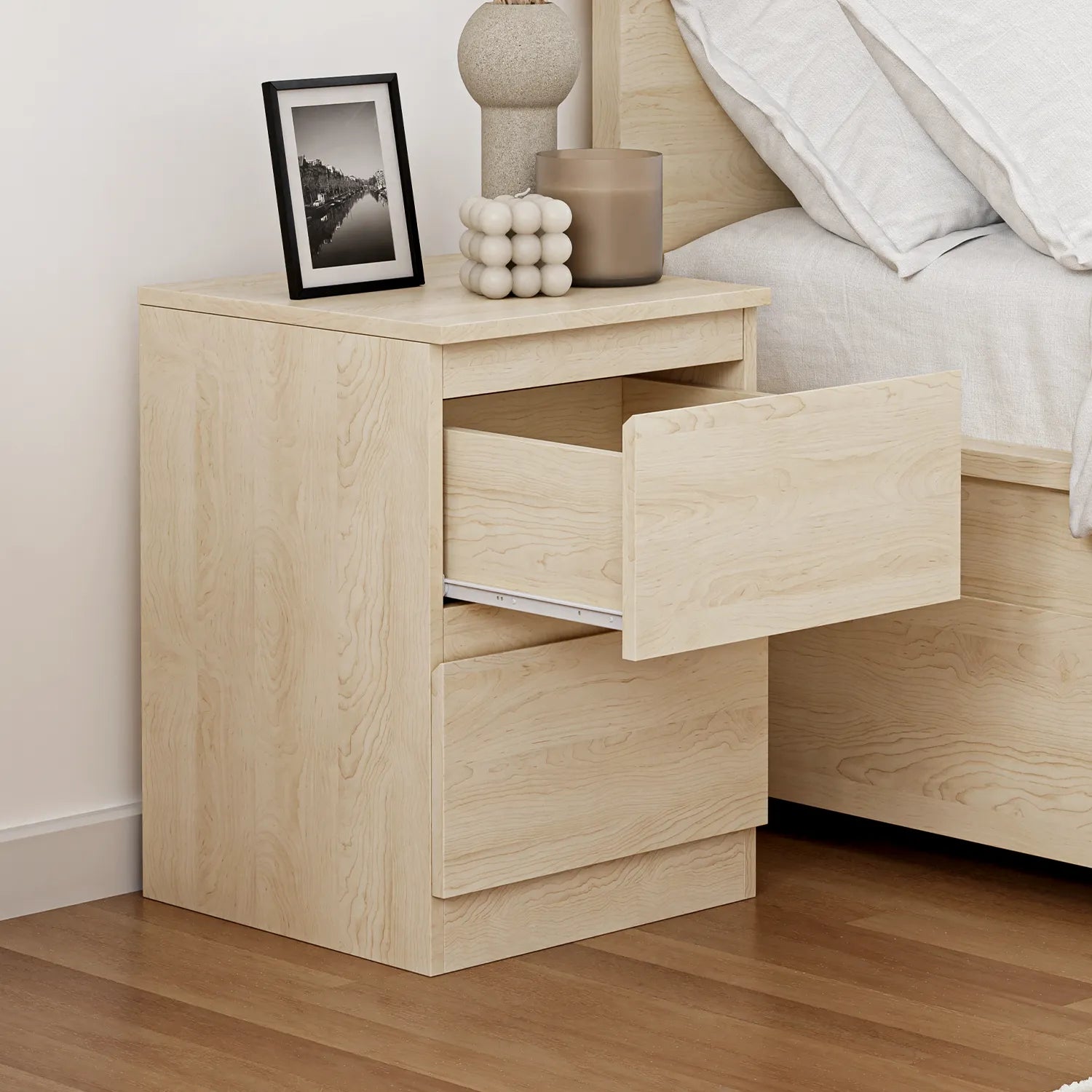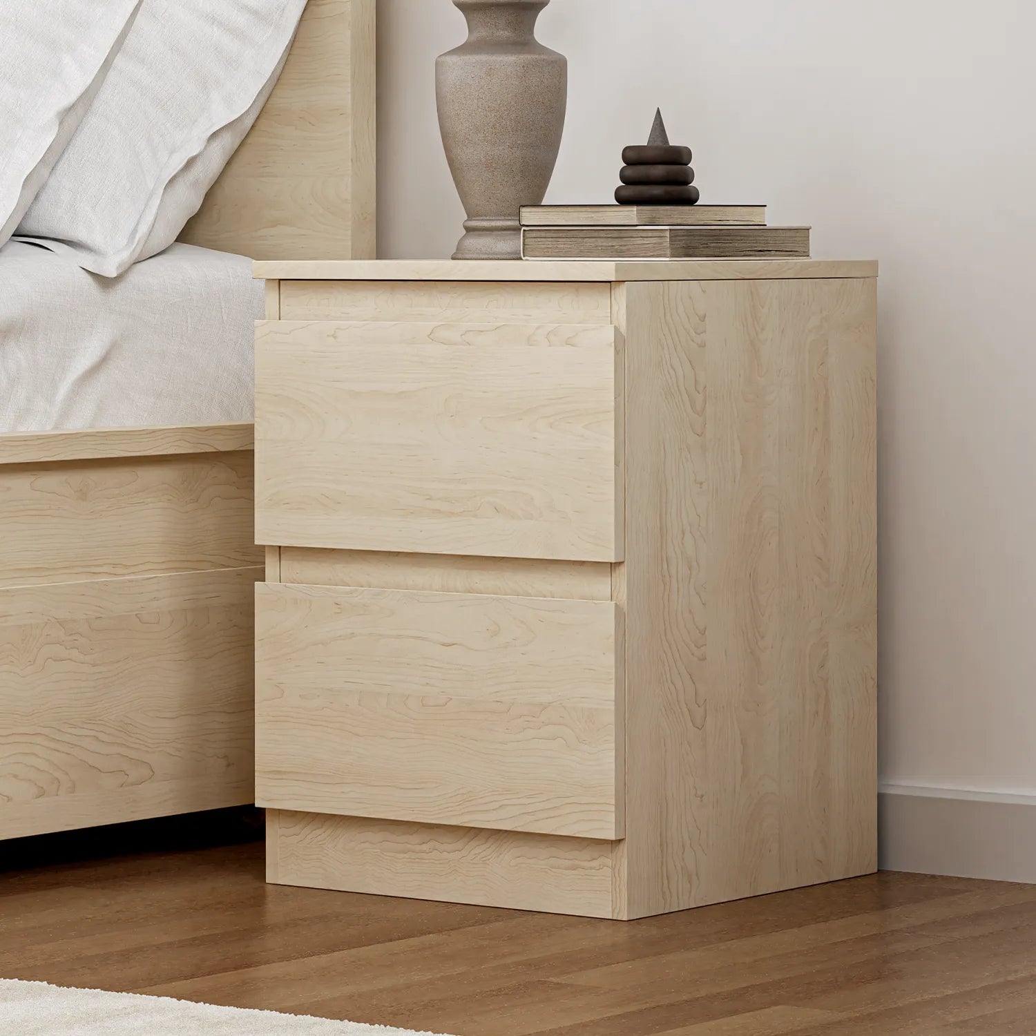 Table de nuit couleur érable blanc avec 2 tiroirs spacieux. Design moderne et sans poignées, parfaite comme meuble de chevet ou rangement de chambre. Style épuré, format compact, s’agence à tout décor. Mobilier pratique et tendance.