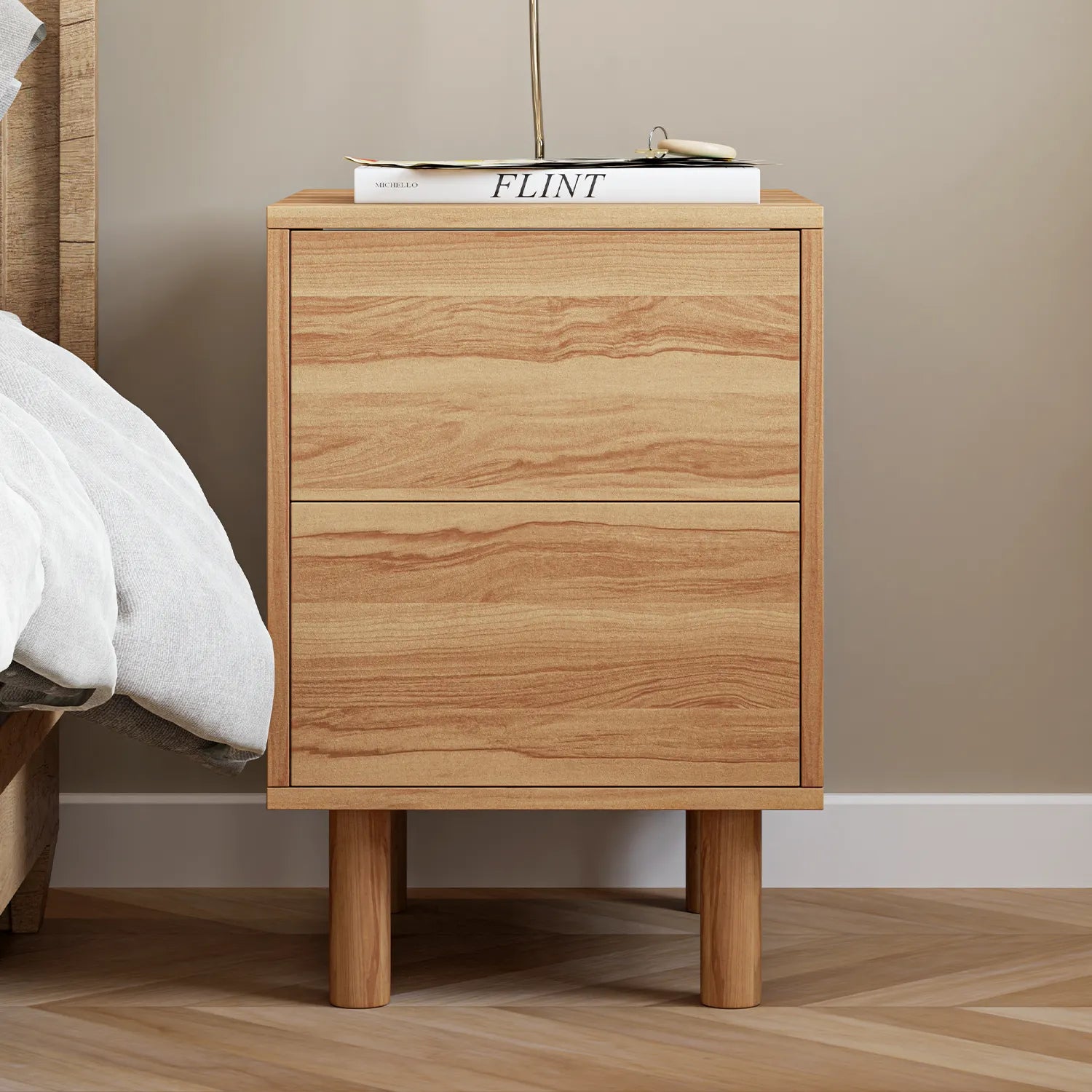 Apportez une touche chaleureuse et minimaliste à votre chambre avec la table de nuit PŪRE. Fabriquée en mélamine style bois naturel, elle offre deux tiroirs spacieux pour un rangement discret. Son design épuré et ses lignes douces s’harmonisent parfaitement avec tous les styles de décoration.