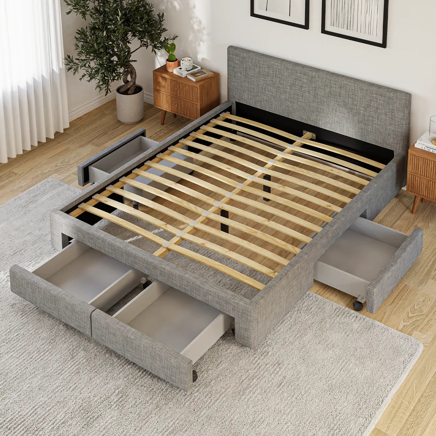 L’espace entre chacune des lattes de la base de lit avec rangement RĒVE double gris clair est de 10 cm (4 pouces).
