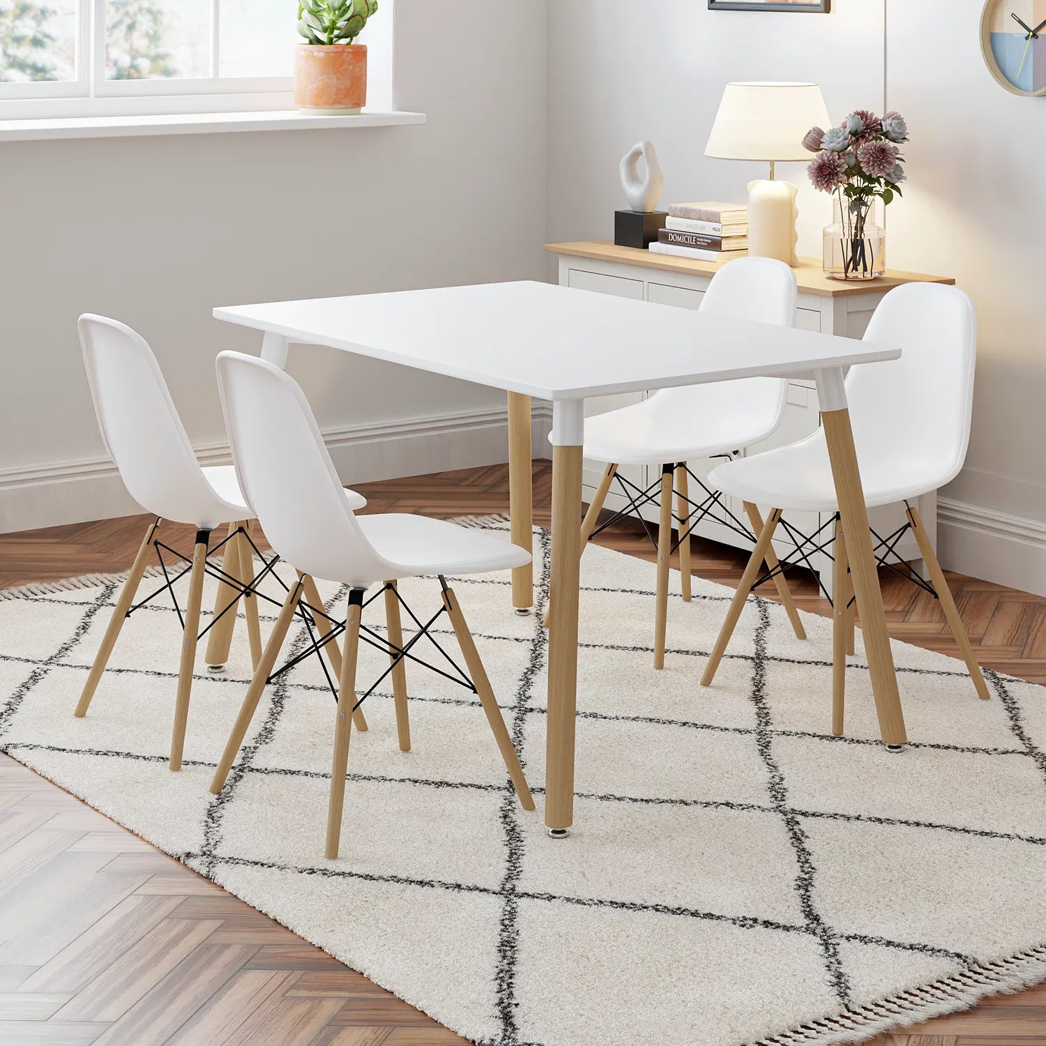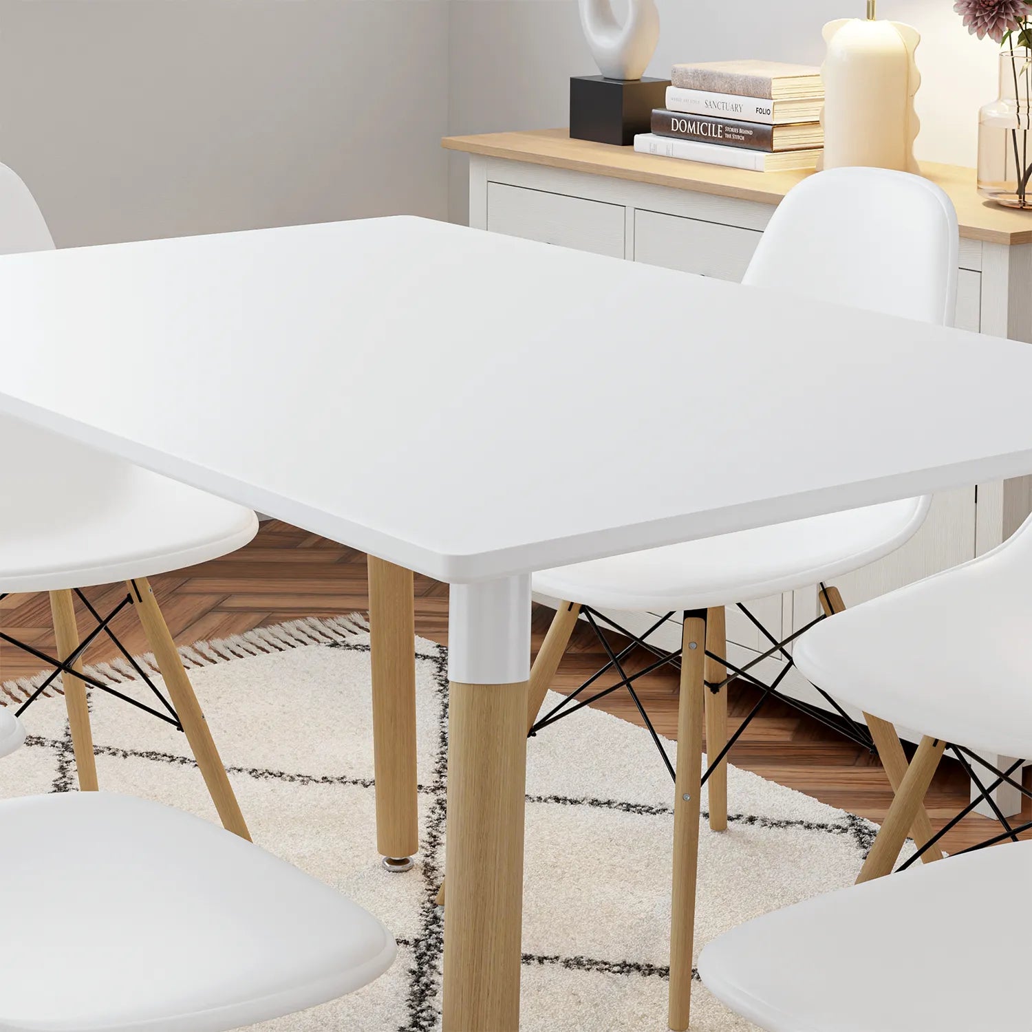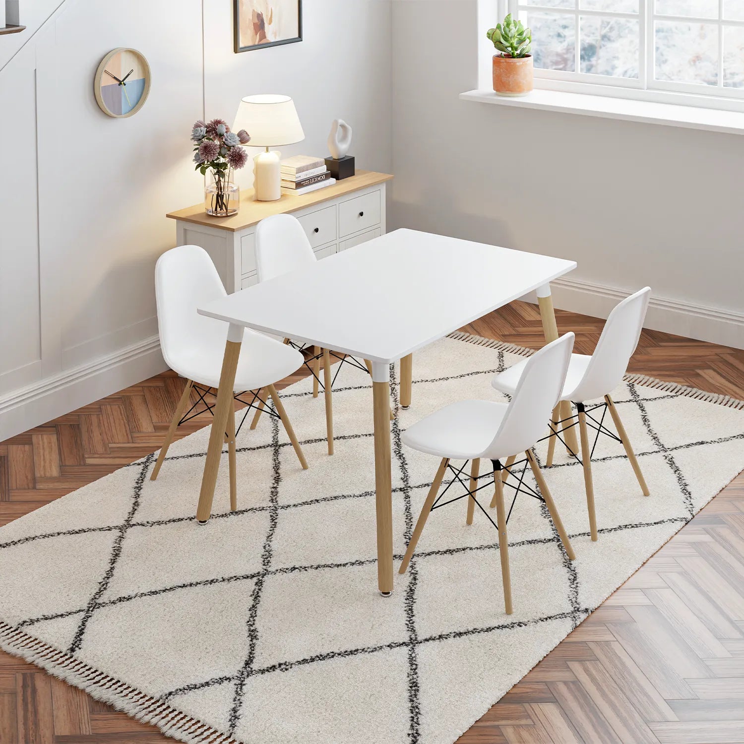 Simplicité et élégance s’unissent dans l’ensemble TĀBLE. Avec sa table blanche aux lignes épurées et ses chaises au design scandinave, il apporte une ambiance lumineuse et moderne à votre espace repas. Parfait pour les petits espaces ou pour créer un coin repas convivial et stylé.