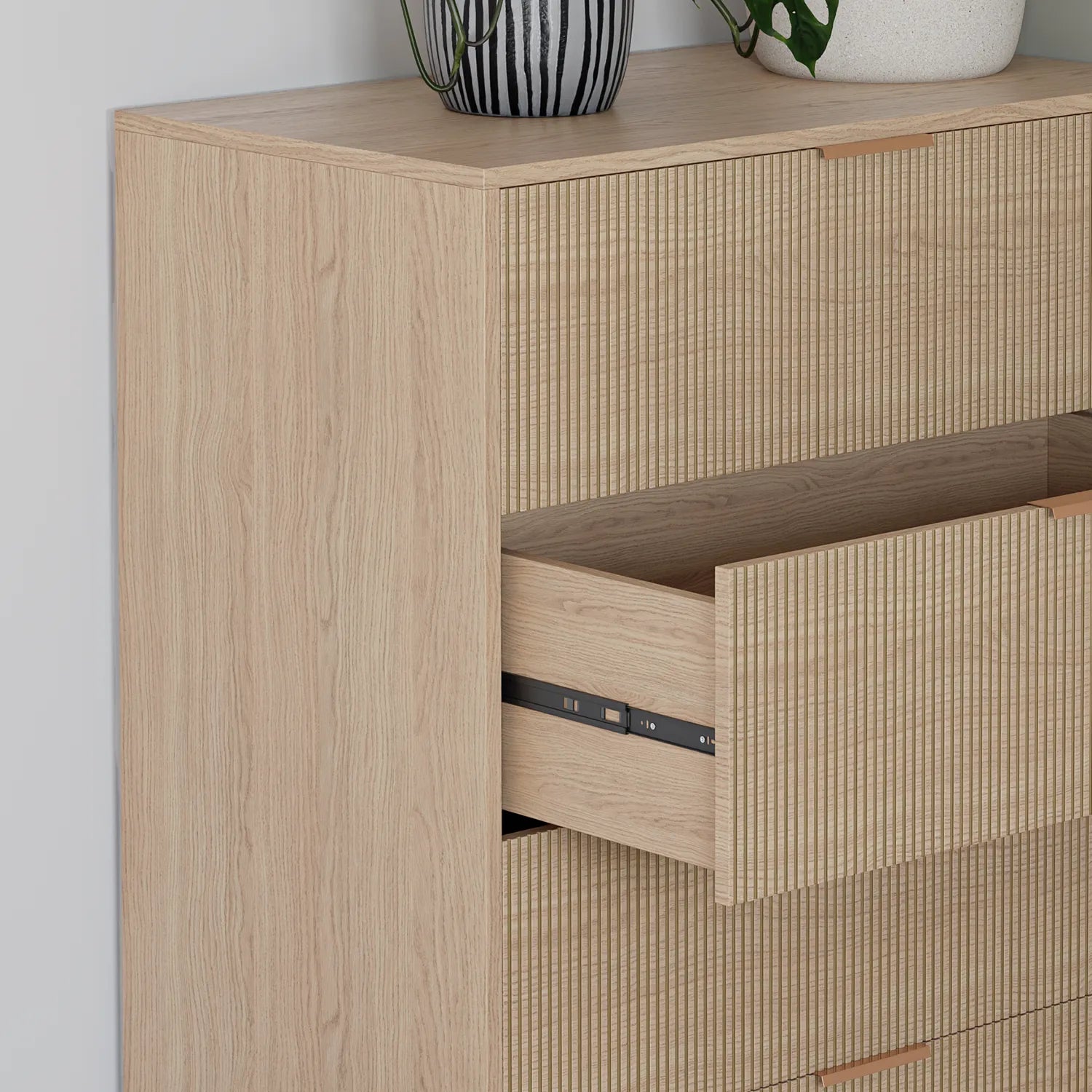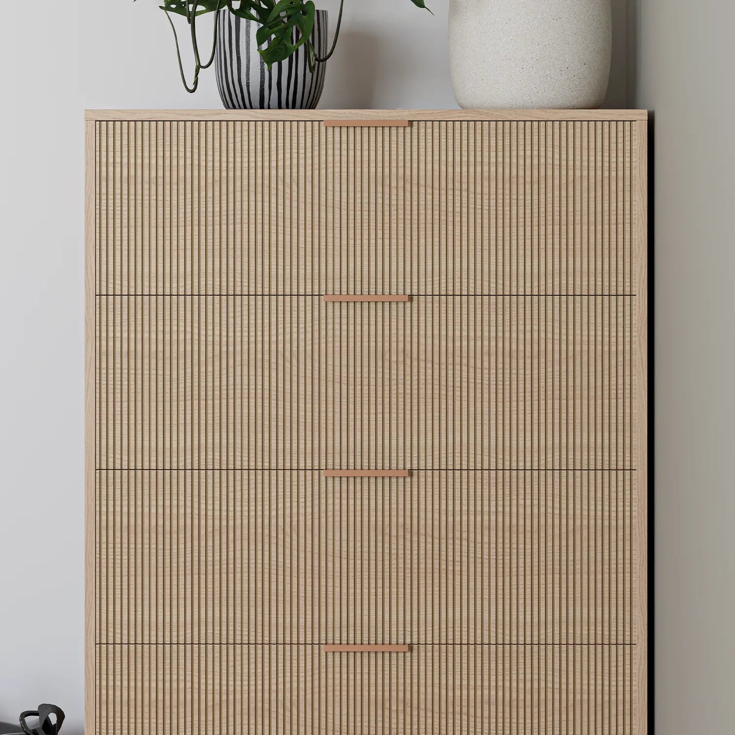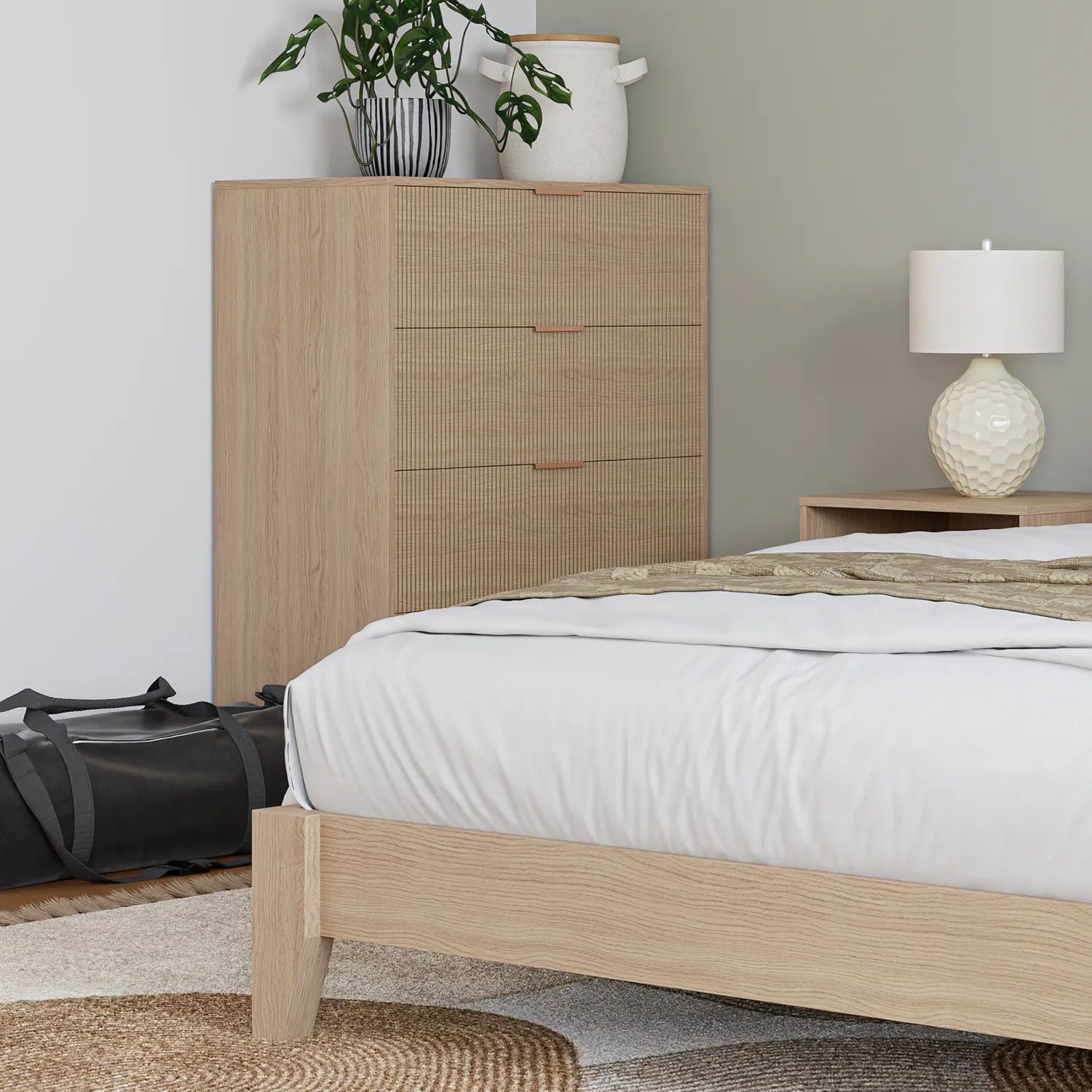 La commode ZĒN à 4 tiroirs allie rangement généreux et design apaisant. Ses façades texturées, sa finition douce effet bois clair et sa silhouette verticale structurent la chambre avec élégance, tout en offrant une organisation simple et soignée au quotidien.